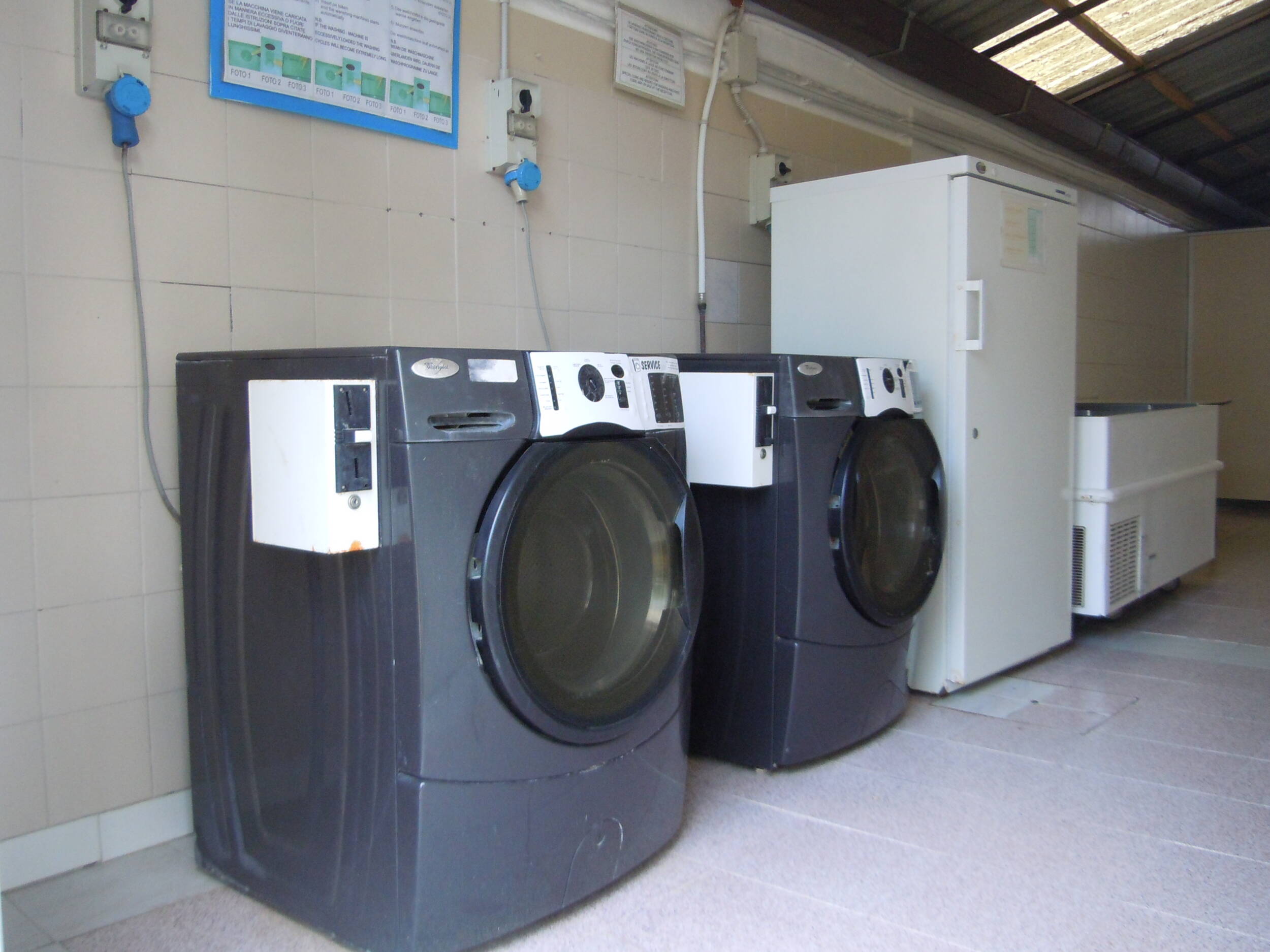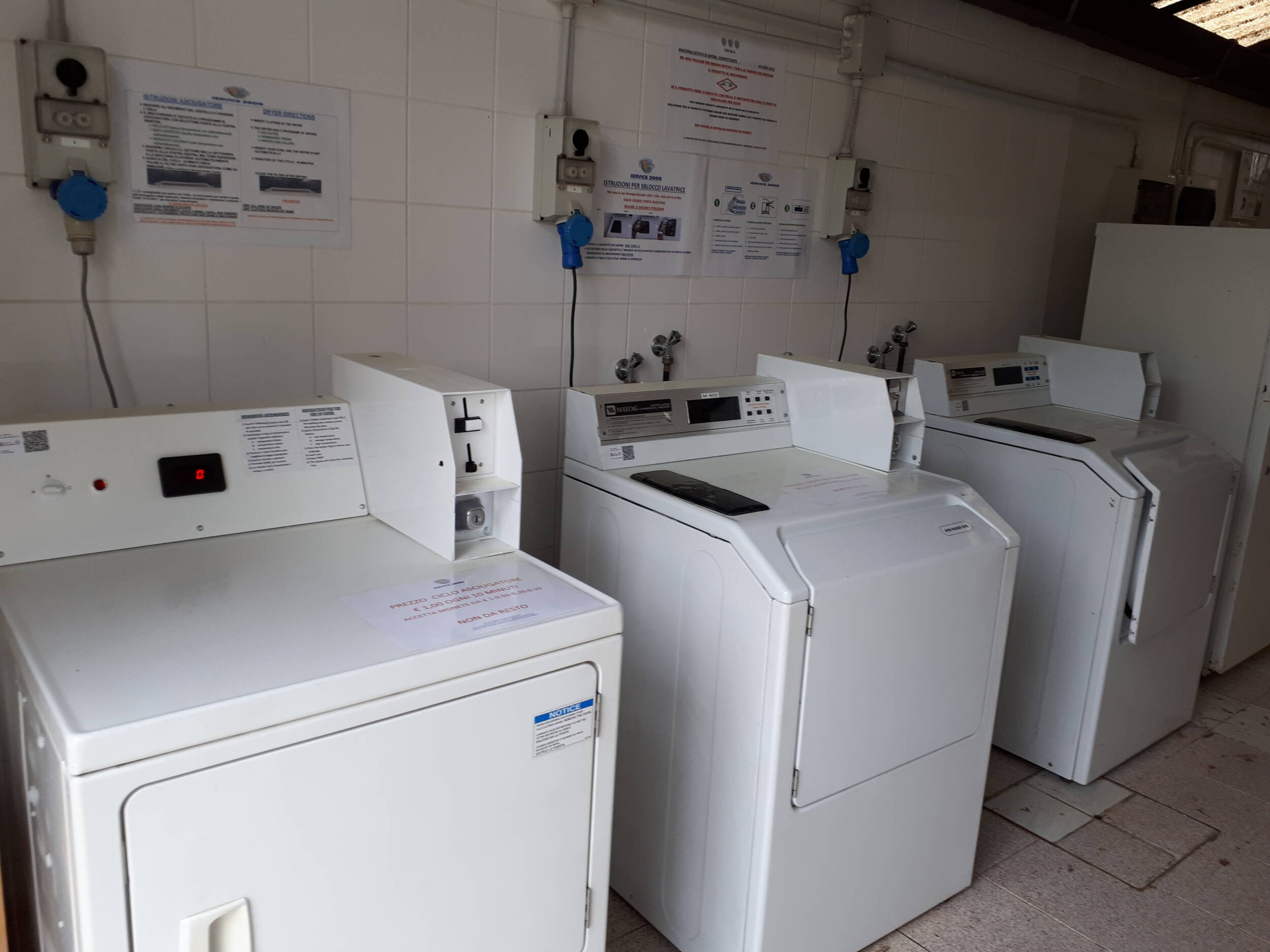 Macchine Lavaggio: Le lavatrici sono generalmente moderne e in buono stato, con diverse capacità a seconda delle esigenze (per esempio, 5 kg o 7 kg di bucato). Per utilizzarle, bisogna inserire i gettoni (o monete) nella macchina. La lavatrice dispensa il detersivo in modo automatico.