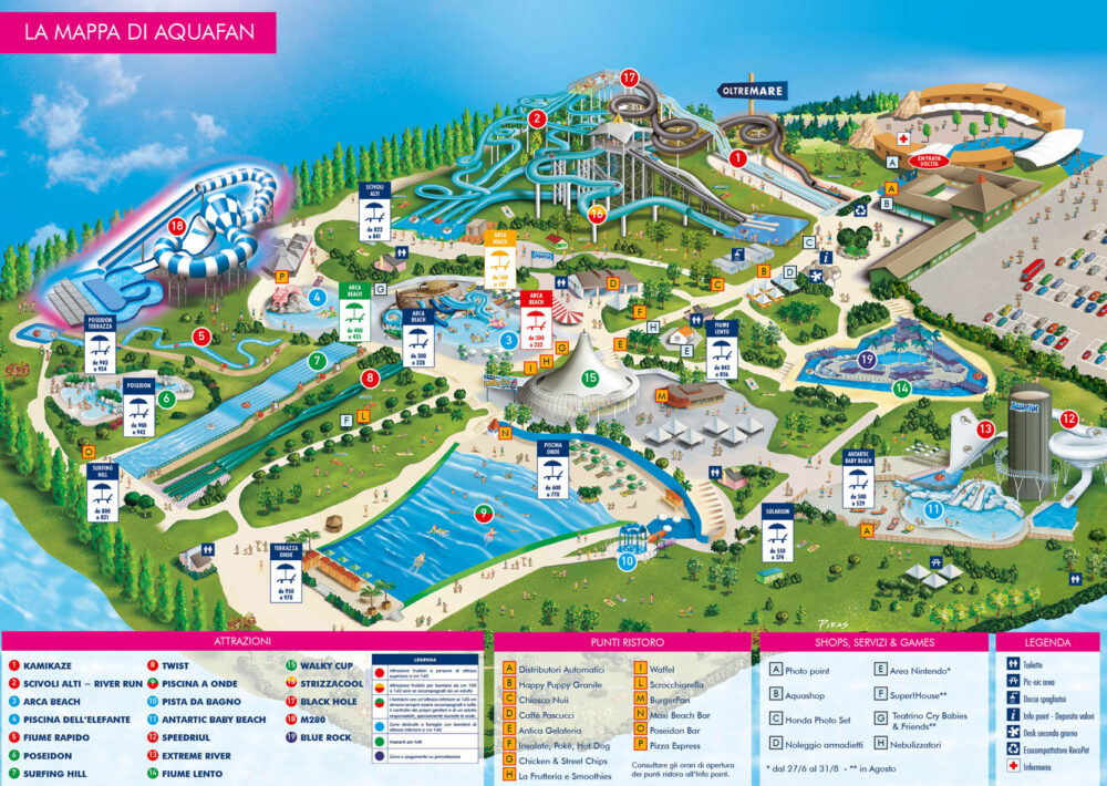 Aquafan in Riccione ist ein Wasserpark mit vielen Attraktionen, perfekt fĂĽr einen Tag voller SpaĂź und Entspannung. Hier sind einige der Hauptattraktionen: